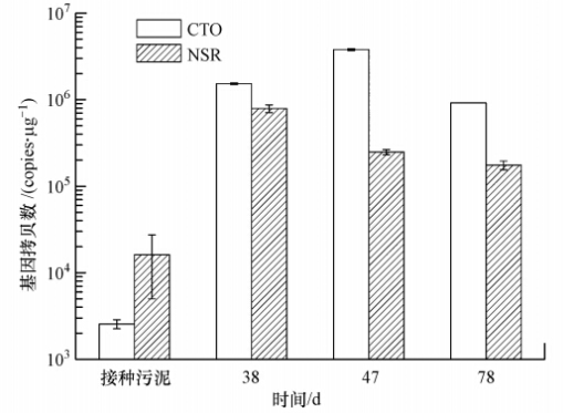 采用實時定量PCR分析接種前后污泥和生物膜中功能基因的含量.采用AOB的16S rRNA(CTO)定量表征氨氧化菌的豐度變化,以NOB的16S rRNA(NSR)表征亞硝酸鹽氧化菌的豐度變化.圖 6為反應器接種前污泥和接種后生物膜中功能基因含量對比圖,接種前污泥的CTO和NSR含量分別為2.56×103和1.62×104 copies · μg-1(以DNA計).采集反應器穩定運行至38 d時亞硝化階段的生物膜,得到系統微生物CTO和NSR含量分別為1.53×106和7.91×105 copies · μg-1.相比于活性污泥系統,生物膜系統微生物豐度都有2~3個數量級的提高.AOB和NOB功能基因的比例也由接種前的0.16提高到1.94,說明MABR中AOB逐步成為優勢菌群,同時單位生物量AOB微生物豐度值也比普通活性污泥高.