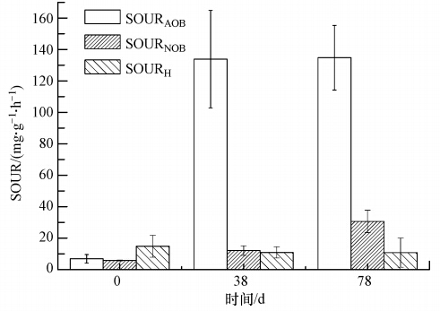 比氧利用速率(以SOUR表征)是評價微生物代謝活性的重要指標,圖 5為不同運行階段MABR生物膜活性(SOUR)的變化情況.從圖 5可以看出,在運行至38 d時,相較接種前污泥,MABR中生物膜AOB、NOB的SOUR活性都有較大程度的提高,分別為(133.9±31.1)和(12.1±3.1)mg · g-1 · h-1(以每g SS利用的O2量(mg)計),AOB活性增加明顯.主要是因為MABR中特殊的生物膜分層結構及進水高氨氮濃度等環境有助于AOB的積累和活性的表達,這也與反應器中出現亞硝酸鹽的大量積累相符.雖然進水中沒有有機底物但仍然有異養菌的存在,生物膜中的異氧菌以微生物分泌的胞外聚合物(EPS)為基質進行代謝和生長繁殖.與Liu等(2010)研究的MABR生物膜SOURAOB為52.0 mg · g-1 · h-1相比,本研究的AOB活性要高.在78 d時,由于高氨氮負荷下氧傳質速率的增加,AOB和NOB活性也有所增高,但AOB活性僅升高至(134.8±20.6)mg · g-1 · h-1,而NOB活性由于外部基質的抑制減弱從(12.1±3.1)mg · g-1 · h-1升高到(30.6±7.1)mg · g-1 · h-1.這也與運行第Ⅳ階段出水硝酸鹽氮濃度的增加對應,也從微觀上說明了過厚的生物膜由于傳質的限制,難于保持對NOB的持續抑制和亞硝化的穩定實現,表明生物膜厚度控制對實現MABR亞硝化穩定運行的重要性.