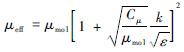 有效粘度μeff可由圖片關(guān)鍵詞得到。方程(2~4)中的系數(shù)αT ,αk和αε分別為能量方程?k方程?ε方程的有效Prandtl數(shù)的倒數(shù)。它們由下式得到: