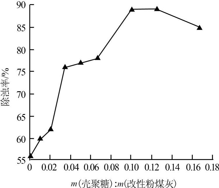 由圖1可知,隨著殼聚糖與改性粉煤灰質(zhì)量比的增加,廢水除濁率先升高后下降,質(zhì)量比為0.1時除濁率最高,達(dá)到89%。原因主要為改性粉煤灰單獨存在時,其與高嶺土表面的負(fù)電荷有一定排斥作用,除濁效果較差,當(dāng)加入殼聚糖后可產(chǎn)生電中和與架橋作用,其包裹在粉煤灰表面使粉煤灰?guī)д姾桑c高嶺土表面的負(fù)電荷發(fā)生電中和作用,有利于吸附和凝聚;但隨著殼聚糖的增加,粉煤灰與高嶺土顆粒表面均被占據(jù),不存在吸附空位,不利于殼聚糖的架橋作用,同時廢水中高嶺土顆粒表面的負(fù)電荷被完全中和后,剩余的正電荷使其表面電荷性質(zhì)反轉(zhuǎn),顆粒間斥力增大,不利于除濁。因此殼聚糖與改性粉煤灰最佳質(zhì)量比為0.1。