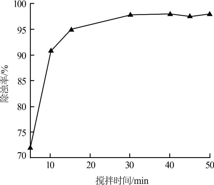 分別取100 mL高濁水樣7份置于150 mL燒杯中,分別加入0.3 g質量比為1∶10的復合吸附劑,攪拌一定時間,靜止15 min,測定其濁度,考察攪拌時間對除濁率的影響,結果見圖3。由圖3可知,攪拌時間對濁度去除率的影響較大。前10 min除濁率變化急劇,是因為攪拌時間太短,吸附劑與水中顆粒沒有充分接觸。10~30 min時除濁率隨攪拌時間的增加而增大。攪拌時間超過30 min后,濁度去除率基本保持不變,說明此時吸附劑的吸附已接近飽和。因此最佳攪拌時間為30 min。