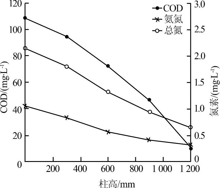 污水從進水槽流出,通過蠕動泵加壓后進入生物濾柱底部,處理后從濾柱上方的出水口溢流出水。采用連續(xù)曝氣方式,生物濾柱的溶解氧控制在3~4.5 mg/L,濾柱的水力停留時間為24 h。