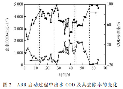 圖2 為ABR 啟動過程中出水COD 及其去除率的變化曲線。如圖所示,ABR 啟動過程可以分為5個階段,每個階段平均運行時間為兩周左右。在第1 階段(1 ~ 13 d), ABR 進水COD 控制在2 000mg·L - 1 ,對應的有機負荷(OLR) 為2. 0 kg COD·(m3 ·d) - 1 ;起初,ABR 在常溫下運行,出水COD在1 000 mg· L - 1 以上, 然后控制反應器溫度在32 ℃ 左右, ABR 出水的COD 逐步下降到500mg·L - 1 以下,去除率最終大于75% 。在第2 階段(14 ~ 26 d) 中設定OLR 為2. 5 kg COD·( m3 ·d) - 1 ,ABR 進水COD 控制在2 500 mg·L - 1 左右,其去除率在80% 左右,最高時可達90% 以上。進入第3 階段(27 ~ 44 d) ,ABR 進水COD 控制在3 250 mg·L - 1 ,由于反應器保溫設施運行不穩定,導致該階段ABR 的COD 去除率不穩定;出水COD 在啟動32 d 左右開始突然上升,相應的COD 去除率甚至出現低于40% 的現象,盡管如此,ABR出水pH 保持在6. 7 ~ 7. 2 之間,VFA 低于3. 0 mmol·L - 1 ,表明反應器并沒有發生酸化;這種現象一直持續到第4 階段(45 ~ 56 d) 結束,當進水COD 在4 400 mg·L - 1 時,ABR 的COD 去除率仍然較低( < 60% ) 。為了改善這種情況,在此階段后期對ABR 的保溫設施進行維修,以確保反應器的運行溫度控制在32 ~ 35 ℃ ,在第5 階段(57 ~ 64 d) ,ABR 有機負荷設定為5. 7 kg COD·( m3 ·d) - 1 ,進水COD 在5 700 mg·L - 1 ,反應器的出水COD 逐步降低,COD 的去除率最終穩定在98% 左右,表明ABR 啟動成功。