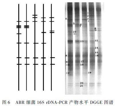 3)PCR-DGGE 分析結果表明,ABR 從第1 格室到第5 格室微生物的種類和豐度依次遞減,不同格室中微生物群落發生了演替。其中序列最相似的產酸菌包括:Raoultella ornithinolytica、Uncultured Clostridialesbacterium、Staphylococcus sp. 、Propionibacterium sp. 、Uncultured Acidobacteria bacterium、Brevibacterium casei等,序列最相似的產甲烷菌Uncultured Firmicutes bacterium 等,以及序列最相似的產氫菌Uncultured Clostridiumsp. 等。