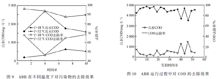 圖9 為溫度變化對ABR 處理效果的影響曲線。當反應器溫度為18 ℃ 時,COD 去除率在45% ~ 70%區間內波動,其平均值為61. 91% ;當溫度上升到32 ℃ 后,ABR 的COD 平均去除率增加到81% 。由此可見,ABR 在中溫條件下運行效果更好。已有的研究表明,ABR 中污泥微生物適合在中溫條件下生長;降低溫度會導致污泥中絮狀沉淀增多,產生大量細胞殘骸,對微生物種群結構和數量產生不利的影響 。