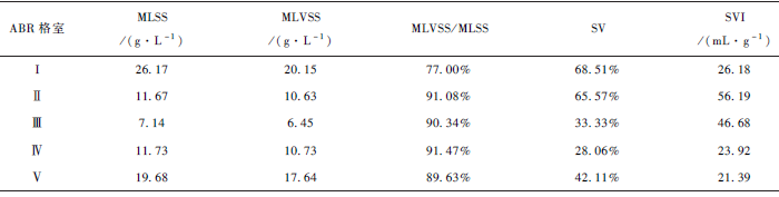 表2 為ABR 啟動成功后各格室顆粒污泥的理化特征。可見,ABR 第3 格室中顆粒污泥的MLSS 在5. 0 ~ 10. 0 g·L - 1 之間 ,其他格室中厭氧顆粒污泥的MLSS 均大于10. 0 g·L - 1 。第1 格室厭氧顆粒污泥的有機組分的比例為77. 00% ,第2、3、4 和5 格室均大于89% ,遠高于姜瀟的50% ,高于接種污泥。說明反應器各格室污泥中生物質的含量普遍較高,這可能是由于接種污泥為UASB 中的顆粒污泥、ABR 的高負荷啟動和運行等因素所導致的結果。反應器各格室中污泥顆粒的沉降比(SV)大小順序為I> Ⅱ > Ⅴ > Ⅲ > Ⅳ。從污泥體積指數(SVI) 可以看出,第4 格室中顆粒污泥的SVI 最小,第2 格室中的SVI 最高。這表明第2 格室中顆粒污泥的沉降性能和壓縮性能最好,而第4 格室最差,高于提出的顆粒污泥SVI 為10 mL·(g SS) - 1 的數值。