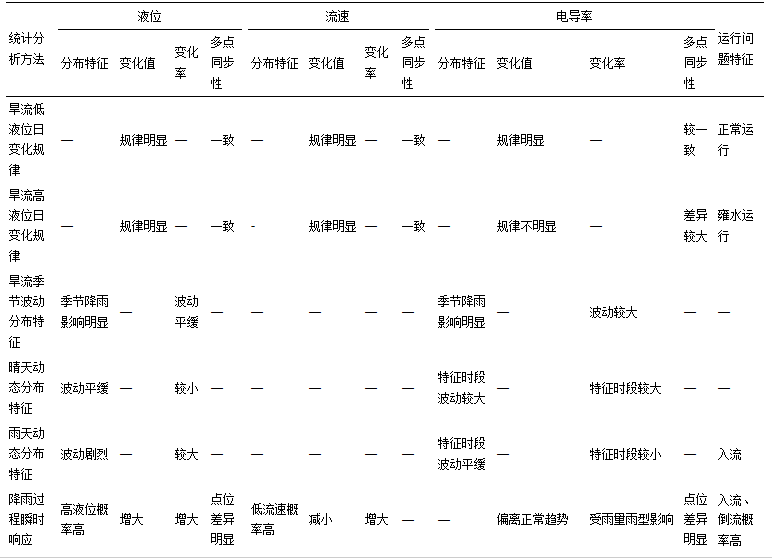 基于長(zhǎng)期在線監(jiān)測(cè),結(jié)合連續(xù)數(shù)據(jù)解析方法處理得到不同指標(biāo)分布特征、 動(dòng)態(tài)波動(dòng)特征和不同監(jiān)測(cè)點(diǎn)特異性特征,構(gòu)建混流制管網(wǎng)運(yùn)行特征庫(表 1),為管網(wǎng)運(yùn)行管理和故障診斷工作提供數(shù)據(jù)和信息支持. 基于多指標(biāo)、 多點(diǎn)協(xié)同分析的方法表征了不同情景的特征,對(duì)液位、 流速、 電導(dǎo)率的變化值、 變化率、 長(zhǎng)期分布特征以及多點(diǎn)同步特征進(jìn)行了總結(jié),并據(jù)此可以實(shí)現(xiàn)對(duì)管網(wǎng)存在的入流、 倒流問題的定性診斷.具體參見 污水處理技術(shù)資料或污水技術(shù)資料更多相關(guān)技術(shù)文檔。