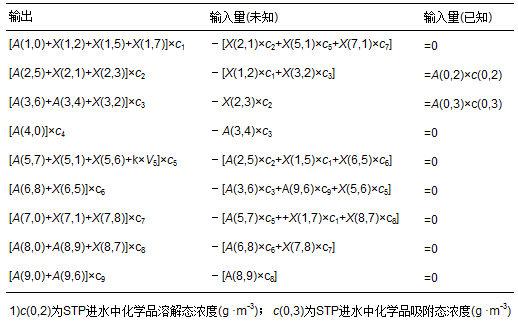 根據概念模型的9個箱體,可以寫出一個九元一次的總質量守恒方程,具體見表 2. 如果A(i,j)、 X(i,j)、 c(0,2)和c(0,3)已知,解九元一次方程即可求解各箱中化學品濃度,進而計算化學品經污水處理后向大氣、 地表水、 污泥的排放比例及生物降解比例.