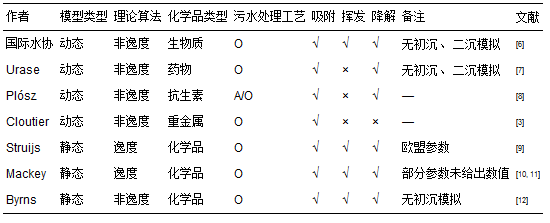 通過實際測定的方式評估化學品在STP中的暴露通常難度很大,一方面是因為環境介質多種多樣(如,水、 污泥、 大氣等),實際測定費時費力,且個別的實測數據代表性也不強; 另一方面,對于新化學物質,由于還未生產和使用,無法測定其在環境中的暴露水平. 因此化學品在STP中的暴露評估主要依靠模型進行預測. 國際上針對STP的操作條件建立了不同種類化學品的STP預測模型(見表 1),如:國際水協已經建立STP中預測碳、 氮和磷歸趨的活性污泥數學模型[6]; Urase等[7]、 Plósz等[8]分別構建了污水處理過程中藥物、 抗生素的歸趨動態預測模型; 文獻[9, 10, 11, 12]構建了外源性化學品在STP中的歸趨靜態預測模型,SimpleTreat模型[9]和STPWIN模型[10, 11]分別被歐盟和美國用于化學品環境管理登記或風險篩查過程.
