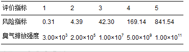 式中,Rk:風(fēng)險(xiǎn)指標(biāo)的等級(jí)閾值,共5級(jí); yjk:第j項(xiàng)污染物的k級(jí)標(biāo)準(zhǔn)值無量綱化,其值為j項(xiàng)污染物k級(jí)標(biāo)準(zhǔn)值(×10-6)與j項(xiàng)污染物的嗅閾值(×10-6)的商. 污染物的k級(jí)標(biāo)準(zhǔn)值無量綱化值參見表 2中惡臭強(qiáng)度和污染物濃度關(guān)系. 該關(guān)系是根據(jù)日本的《惡臭防止法》和《惡臭污染評(píng)估技術(shù)及環(huán)境基準(zhǔn)》中的相關(guān)惡臭污染物濃度與強(qiáng)度對(duì)應(yīng)關(guān)系計(jì)算得到[23, 24].