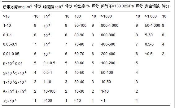 將篩選的指標(biāo)進(jìn)行相應(yīng)分級(jí),給出各個(gè)級(jí)的評(píng)分. 其中,物質(zhì)濃度、 嗅閾值、 檢出率和蒸氣壓均分為10級(jí),采用10分制. 按照Ammore和Hautala提出的劃分標(biāo)準(zhǔn),氣味安全級(jí)別分為5個(gè)等級(jí),為統(tǒng)一各參數(shù)的評(píng)分標(biāo)準(zhǔn),氣味安全級(jí)別也采用10分值,即每級(jí)2分,分值如表 1所示.