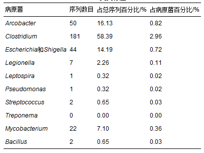 (1)454焦磷酸測序研究污水廠二級出水中微生物群落結構,共發(fā)現(xiàn)12個門的細菌,其中擬桿菌門和變形菌門是主要的門類,且擬桿菌門的主要組成部位為Flavobacteria,變形菌門的主要組成部位為α-、 β-和γ-Proteobacteria. 本研究共發(fā)現(xiàn)11種病原菌,其中梭菌屬和分支桿菌是主要的屬類,此外還有軍團菌等常見的致病性較高的病原菌.