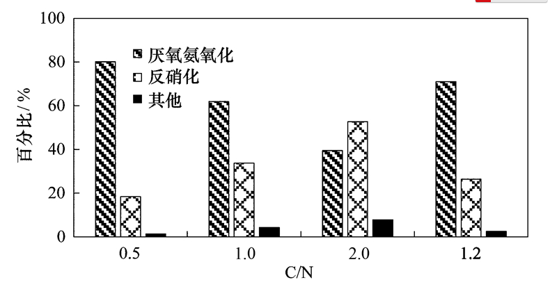 從文獻[14, 15]可知,在有機物存在的厭氧氨氧化反應器內主要存在著厭氧氨氧化反應(ANAMMOX)[式(1)]、 短程異養反硝化反應1[式(2)]、 短程異養反硝化反應2[式(3)]和全程異養反硝化過程(denitrification)[式(4)]. 在這些反應中,厭氧氨氧化反應無需有機碳源,厭氧氨氧化菌可利用NH4+作為電子供體,與NO2-反應生成N2達到脫氮的目的. 短程異養反硝化反應1、 短程異養反硝化反應2和全程異養反硝化反應需要以有機碳源作為電子供體,實現NO3-和NO2-的還原. 因此氮的去除途徑可以通過計算短程硝化作用的反應1、 2和全程反硝化作用消耗的COD和去除的TN來推出,見公式(5)~(6). 圖 4為基于實驗結果和上述提到的式(1)~(4)而計算出的結果. 推測在第二階段,C/N比為0.5時,通過厭氧氨氧化途徑去除的氮平均占80%,異養反硝化的貢獻占18%,其他方式如氨揮發、 微生物合成作用等占2%,證明在C/N比為0.5時,厭氧氨氧化占脫氮過程的主導地位.