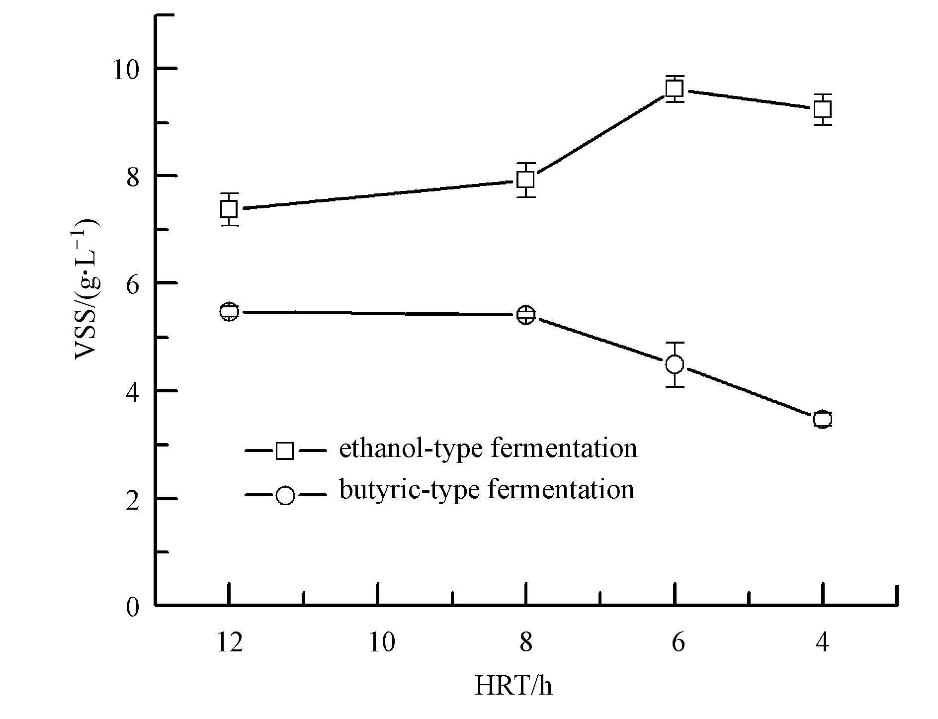 圖6 不同HRT下ACR乙醇型和丁酸型發酵系統中的生物量