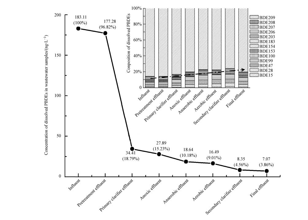 圖2 污水處理流程中溶解態PBDEs濃度和百分比組成變化