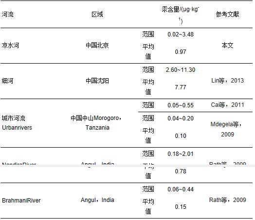 為進一步了解涼水河表層沉積物中汞污染水平,表 3列舉了國內外某些城市河流表層沉積物中汞含量情況.由表 3可知,涼水河表層沉積物中汞含量比國外一些城市河流高,與國內城市河流相比,其處于中間狀態.其中采樣點1、2、3、7和20中的汞總量遠遠高于中山城市河流的汞含量,甚至是中山城市河流表層沉積物中汞含量最高值的6倍,可能是因為這5個采樣點附近有工廠排出污水對涼水河造成了嚴重的點源污染.而涼水河表層沉積物中汞含量總體水平上較高,可能是由于涼水河是典型的非常規水源補給城市河流,其接納污水處理廠出水和未經處理的生活污水造成的.