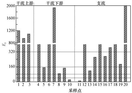 根據潛在生態風險評價法分析涼水河表層沉積物中汞的潛在風險情況(圖 3),并參考生態風險等級劃分表分析涼水河表層沉積物中汞總量的潛在風險程度.由圖可知,涼水河干流上游表層沉積物中汞的Ei范圍為951~1197,平均值為1080,潛在生態風險程度很高;干流下游表層沉積物中汞的Ei范圍為23 ~1934,平均值為499,潛在生態風險程度很高;支流表層沉積物中汞的Ei范圍為10~2019,平均值為456,潛在生態風險程度很高.除個別點(采樣點10和11)處于低潛在生態風險水平外,整體來看涼水河各個河段表層沉積物中汞的潛在生態風險程度都處于很高的水平.