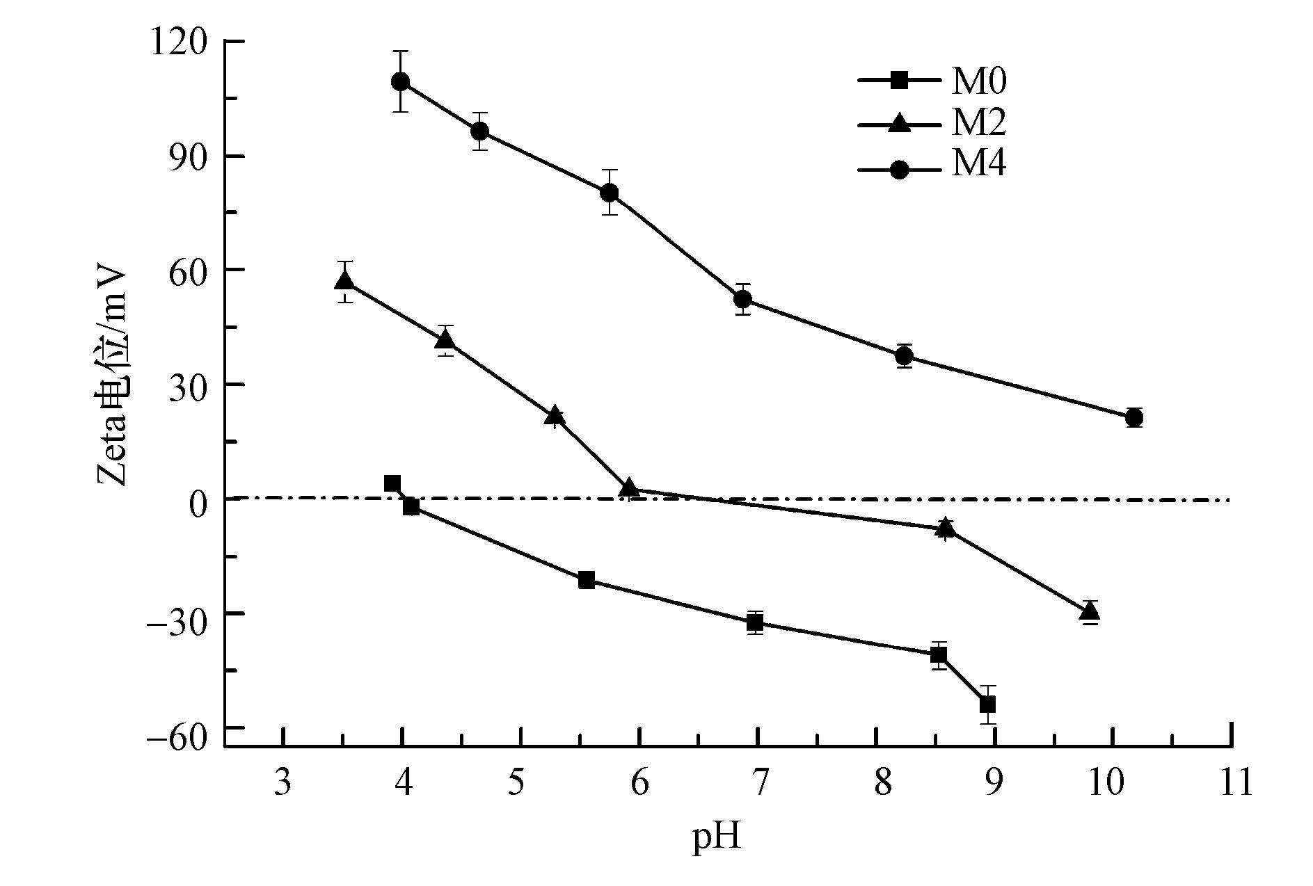 復(fù)合膜表面的荷電性能可以通過Zeta電位儀進(jìn)行分析.圖 4為不同pH值下荷電復(fù)合膜的Zeta電位圖,發(fā)現(xiàn)隨著溶液pH值的增大,膜表面的Zeta電位呈降低趨勢.同時,隨離子液體添加量的增加,膜表面Zeta電位值均增加.由圖 4還可以看出,膜M0和M2的等電點(diǎn)(pI)分別為4.0和6.6,而M4號膜在整個測量的pH范圍內(nèi)均呈正電性,無等電點(diǎn).這是由于聚離子液體的強(qiáng)荷正電性,使復(fù)合膜表面呈現(xiàn)荷正電特性,復(fù)合膜的表面結(jié)構(gòu)示意圖也很好地說明了這個問題(圖 1).因此,可以通過調(diào)節(jié)溶液的pH值,改變反應(yīng)液中離子液體單體的量,以調(diào)控膜表面的荷電性和荷電密度,進(jìn)而提高復(fù)合膜分離和抗污染性能.