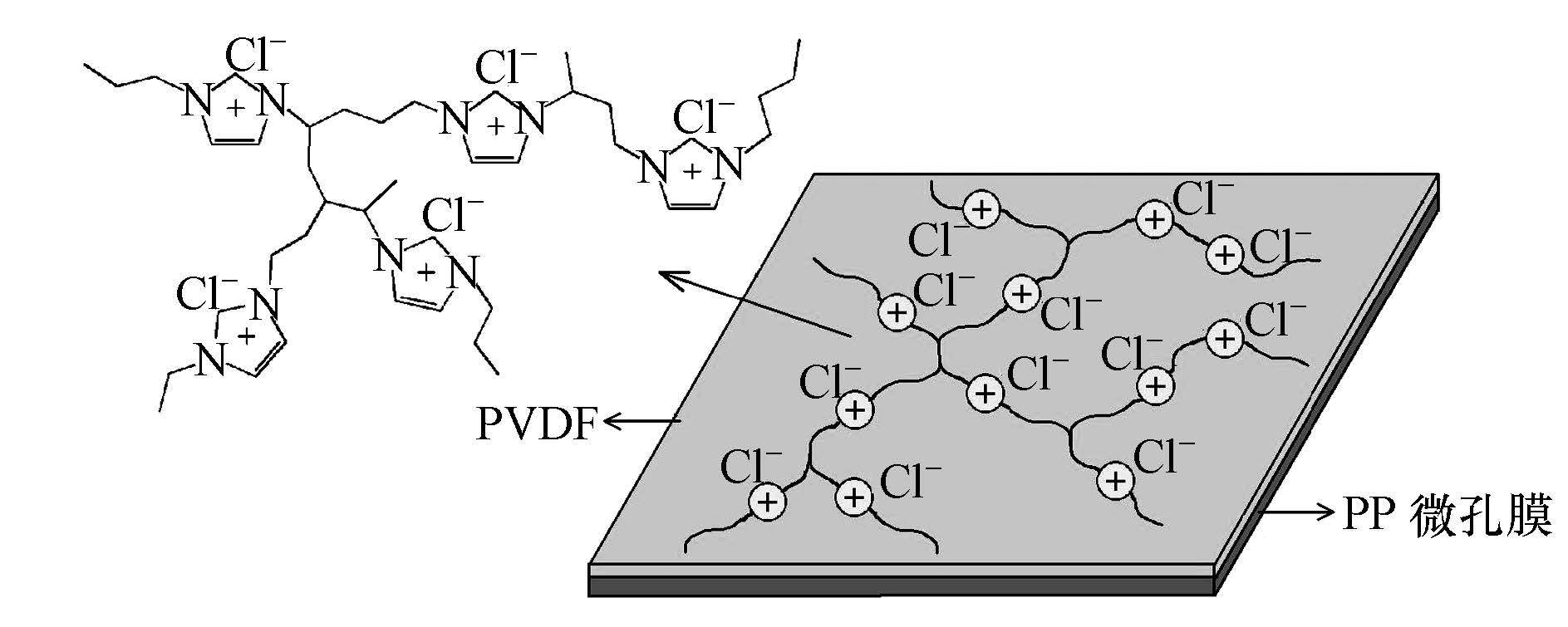在以上研究基礎(chǔ)上,本研究以氯化-1-烯丙基-3-乙烯基咪唑離子液體為反應(yīng)單體,通過自由基聚合制備聚離子液體預(yù)聚液,再將其與聚偏氟乙烯(PVDF)共混以制備聚離子液體/PVDF鑄膜液,然后經(jīng)涂覆工藝,在聚丙烯(PP)微孔膜表面涂覆改性,以制備具有互穿網(wǎng)絡(luò)結(jié)構(gòu)的聚離子液體/PVDF荷電復(fù)合膜.本研究中所采用的涂覆制膜工藝簡單、制膜成本較低,且所采用的PP微孔支撐底膜具有機(jī)械強(qiáng)度高、物理化學(xué)性能穩(wěn)定等優(yōu)點(diǎn),使該膜材料在廢水處理、燃料電池隔膜等方面具有很好的應(yīng)用前景.