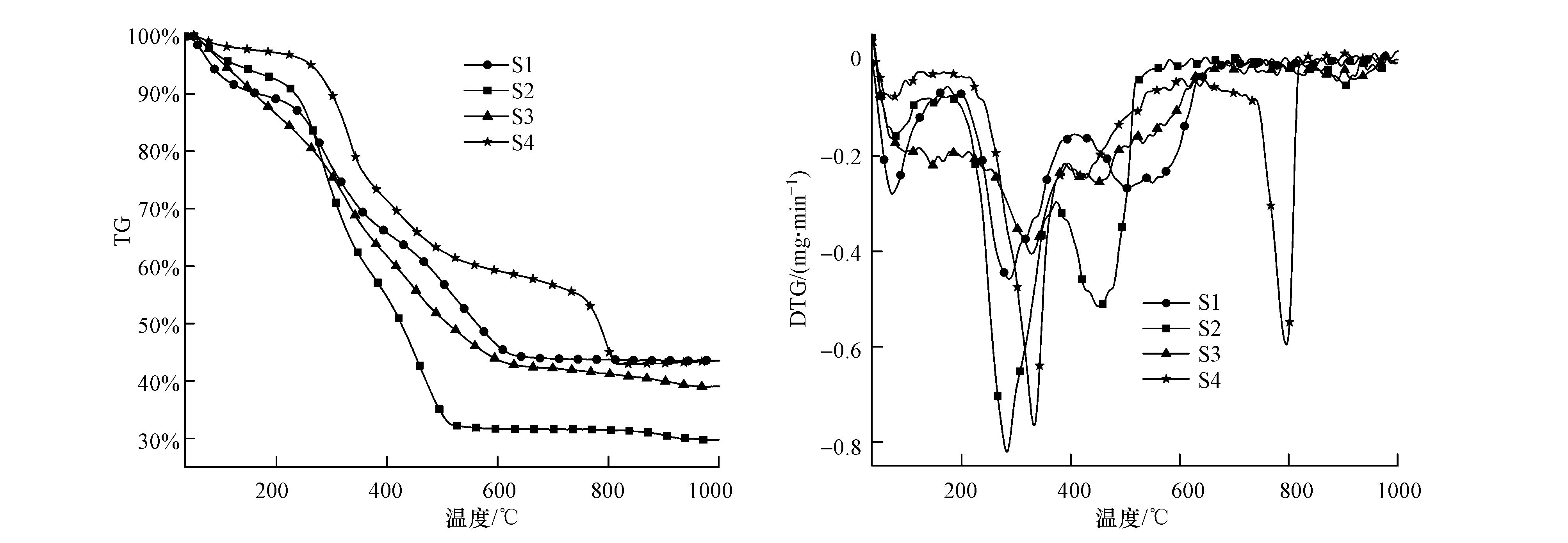 實驗采用德國耐弛公司STA409PC型綜合熱分析儀,獲得試樣熱重曲線(TG)及微商熱重曲線(DTG). 其中熱天平精度: 1 μg; 最大試樣量: 1000 mg; 溫度范圍: 室溫~1400 ℃; 實驗氣氛升溫速率范圍: 0.1~30.0 ℃ · min-1.