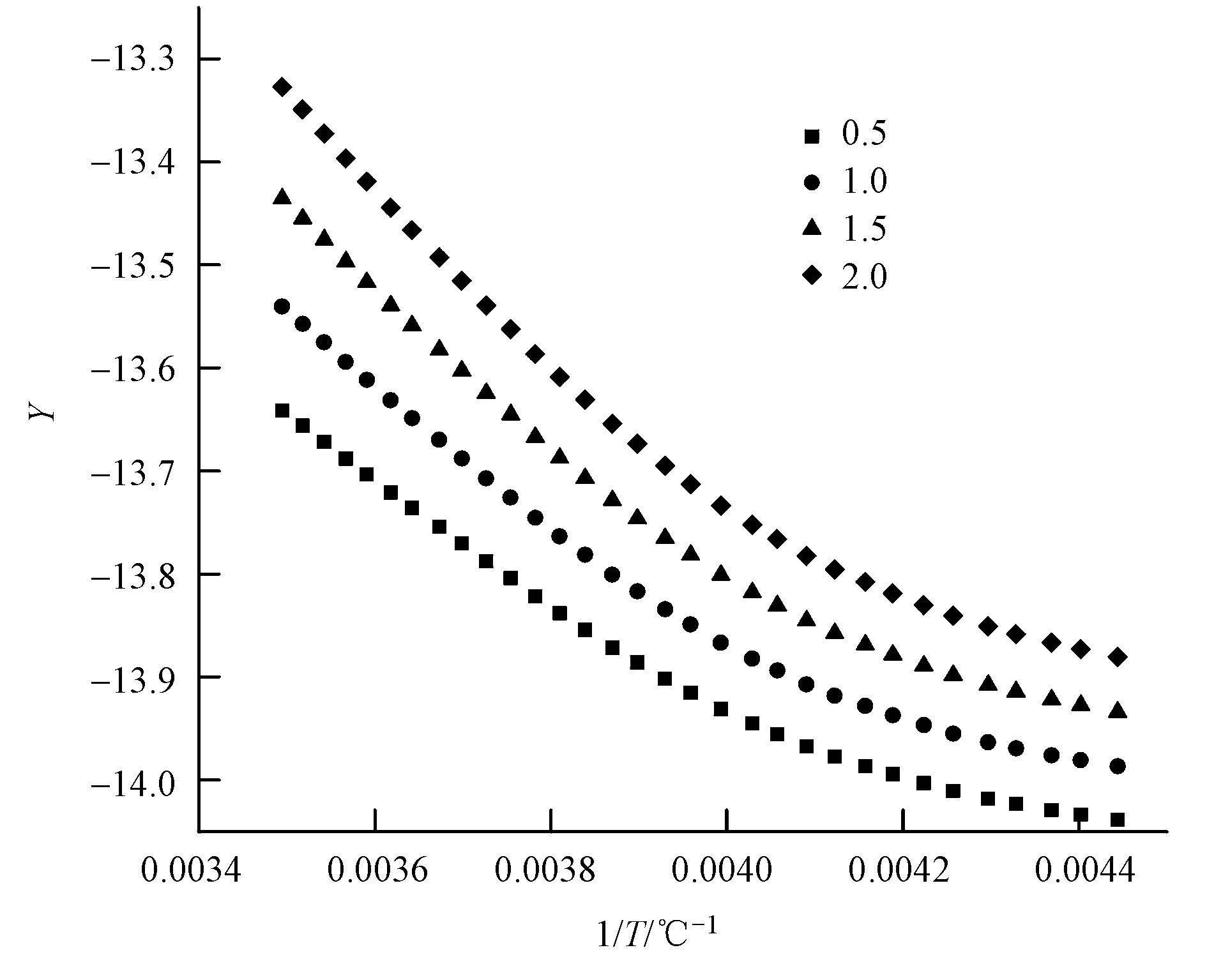 式中,ф為升溫速率(℃ · min-1),ф=dT/dt.令圖片關鍵詞,對于本實驗中反應溫區及大部分E值而言,的值近似看做常數,令b=- E/R,X= 1/T,Y=圖片關鍵詞? (n=1),Y=圖片關鍵詞? (n≠1). 則有,Y= +bX.以不同的反應級數n帶入試探求解,并進行線性擬合,數據的擬合線性越好,則反應機理函數選擇越恰當,由直線的斜率可求得活化能E.