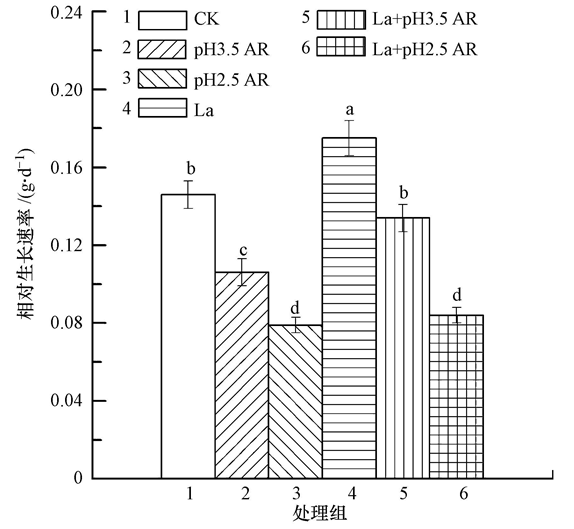 ?圖1 鑭對(duì)酸雨脅迫下水稻相對(duì)生長(zhǎng)速率的影響(圖中數(shù)據(jù)為平均值±標(biāo)準(zhǔn)誤差,不同字母表示各處理間差異顯著(p<0.05),下同)