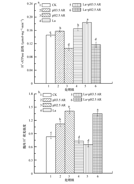 ?圖2 鑭對(duì)酸雨脅迫下水稻葉片質(zhì)膜H+-ATPase活性(a)和胞內(nèi)H+熒光強(qiáng)度(b)的影響
