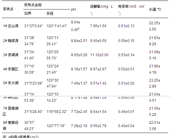 2015年5月18—28日在太湖8個典型區域(竺山灣、梅梁灣、貢湖灣、東部區、東太湖、湖心區、西南湖區和南部沿岸)采集表層水(水面以下0.5 m)和藻類、水生植物及表層沉積物樣品(圖 1).水質基本參數(pH、溶解氧、水溫、電導率)現場測定,測定結果見表 1.采集后的樣品置于冷藏箱中黑暗低溫保存,并立即送往實驗室.其中,水體樣品采用玻璃纖維濾膜(GF/F,Whatman,UK)過濾,并進行溶解性有機碳(Dissolved Organic Carbon,DOC)含量測定及3DEEM、紫外吸收系數UV254的分析.