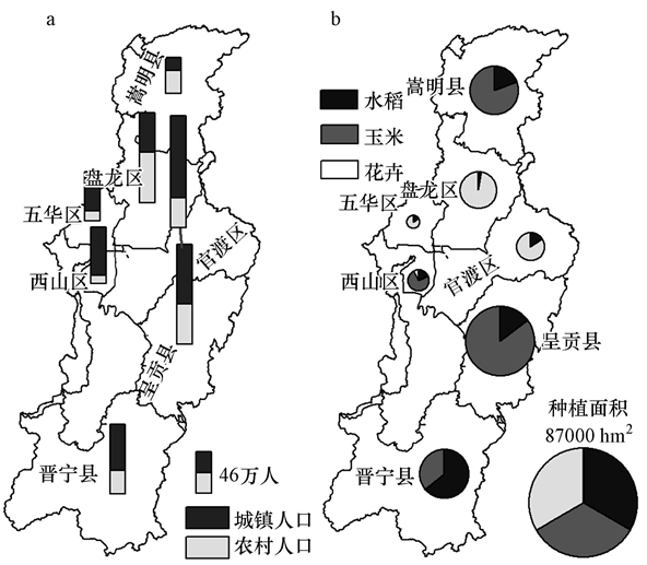 圖4 外流域調(diào)水情景下滇池流域人口(a)與作物的種植分布(b)