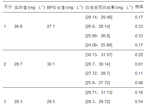 ?  綜上,得出2015年1—5月出水的最終預測結果(表 5).馬爾可夫鏈改進后的預測結果是不通過概率下的區間范圍值,符合污水廠出水水質和檢測結果在一定程度呈隨機變化的特性,通過最大概率區間預測值可以很準確地預測實際出水水質范圍.從該廠2015年1—5月的模擬預測結果可知,出水的實際水質均符合最大概率區間內的預測范圍值,表明基于 BP神經網絡與馬爾可夫鏈的組合預測模型具有較高的精度,可應用于污水處理的水質模擬.