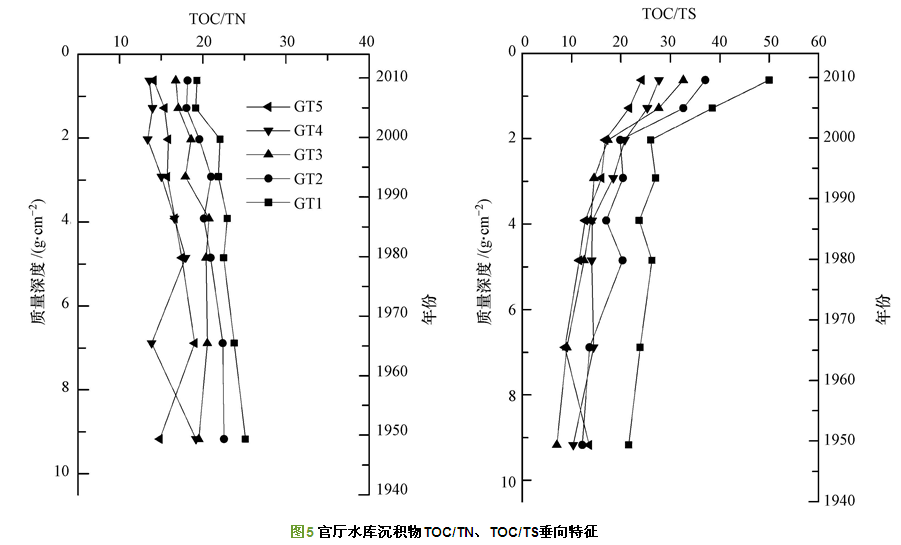 基于酸沉降及硫元素形態轉化過程對營養物質及重金屬毒性的重視,有關土壤、河流及湖泊關于硫的遷移和儲存作用的研究越來越多.官廳水庫各沉積柱TOC/TS值為7.0~50.0(圖 5),垂向分布上表層高于深層,且在0~6 cm呈現明顯降低.一般認為固著沉積物中硫量與有機碳濃度成正相關關系,但官廳水庫中沉積物中有機質與硫化物含量卻呈負相關,表明官廳水庫中硫酸鹽礦化與有機硫化物降解有關,其具體機理過程還有待深入研究.