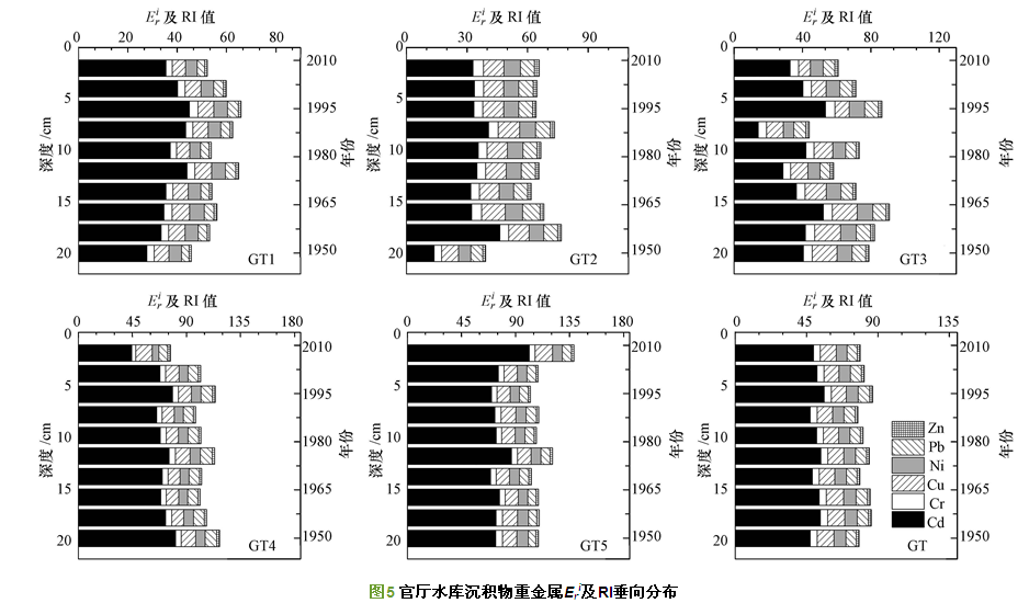 由潛在生態風險指數判斷官廳水庫各采樣點沉積柱中重金屬的綜合生態風險程度(圖 5),從空間分布來看,水庫的RI大小順序為 GT5> GT4> GT3> GT2> GT1,其中,水庫出口(GT5)的RI均值為113,屬于低生態風險.從垂直分布來看,中游庫心區(GT3)和永定河入口(GT4)的RI隨時間變化,生態風險逐漸減小;除水庫出口(GT5)外,其他采樣點在1985年后RI隨著時間的推移均呈現減小的趨勢,但污染仍以Cd為主,其中,采樣點永定河入口(GT4)、水庫出口(GT5)Cd的Eri值分別為69.2、77.4,均屬于中等生態風險.從整體來看,官廳水庫沉積物中重金屬的風險程度隨著時間的推移變化不明顯,各采樣點的RI值中起主要貢獻的是Cd元素,其余重金屬元素貢獻較低,這與Cd的毒性系數較高有關,也是上游化工廠廢物排放導致Cd污染的顯現.