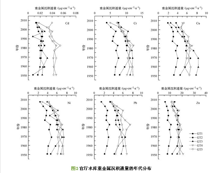 2)官廳水庫各重金屬沉積通量隨時間推移表現出明顯的減小,以1980年以后最為明顯,到2014年減少了約40%.據估算,水庫沉積物中重金屬Cd、Cr、Cu、Ni、Pb和Zn的年沉積量分別為0.0113、3.63、2.09、2.19、1.86和5.72 t.