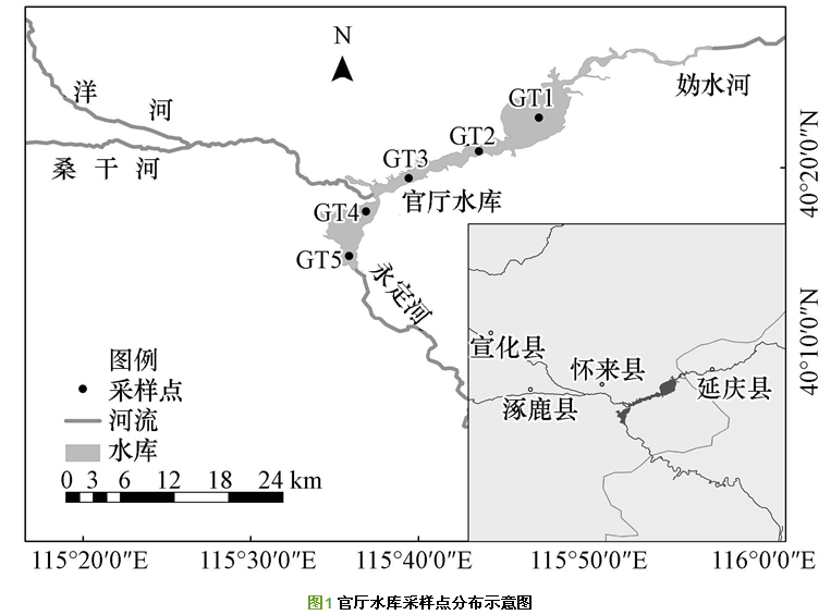 官廳水庫是建國后修建的第一座大型水庫,位于永定河上游,距北京市約100 km(圖 1).流域面積約4.34萬km2,具有供水、防洪、發電、水產、灌溉等多種功能.官廳水庫為東北-西南走向的狹長型水庫,平均水深約為10 m,最大水深18.5 m,周邊地形地貌呈高度異質性,山地、丘陵、河谷、盆地相間分布.入庫水系有媯水河及桑干河和洋河交匯形成的永定河,其中,媯水河、桑干河和洋河中上游水質較好,而洋河的宣化區、下花區和沙城等中下游河段由于集中了工業區和較大城鎮,環境污染嚴重,對水庫水質影響較大