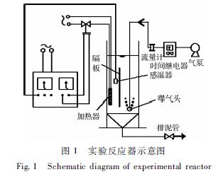 實驗采用自行設計如圖1所示的間歇進水序批式反應器(SBR),反應器的主體以有機玻璃制成,長112mm?寬106 mm?高500 mm,設計水面高度400mm,其有效容積為4L。反應器中間采用有機玻璃隔板,隔板的上端距水面為約為50mm,下端為高度40mm左右的過水通道。采用隔板將反應器主體分割成體積比為6∶4的曝氣區和非曝氣區。非曝氣區通過設置可控溫度加熱器維持水溫恒定。在曝氣區內采用微孔曝氣,為微生物生長提供所需的溶解氧,同時達到泥水混合的效果。