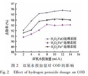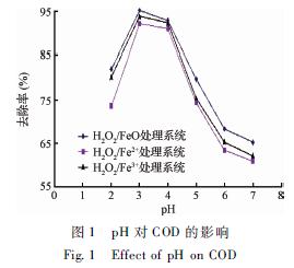 ?  圖1中,3個體系COD的處理效果:H2O2/Fe0體系>H2O2/Fe3+體系>H2O2/Fe2+體系?因為在pH相同的條件下,H2O2/Fe3+體系中,先進行反應(3)生成Fe2+,生成的Fe2+便直接參與到反應(1),并且水中存在的Fe3+數量遠大于Fe2+的,抑制了反應(5),減少了· OH的消耗,提高了Fe2+的有效利用率,使得COD去除率較高;H2O2/Fe0 體系中存在下面的反應[14]: