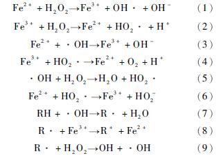 目前,國內外學者對含火炸藥廢水 的主要處理手段是吸附法[4]?萃取法[5]?高級氧化法[6]?電化學法[7]?厭氧-好氧生物法[8]?植物法[9]等。其中吸附法?萃取法是物理處理技術,操作簡單,反應快,但材料成本高且有二次污染[10];高級氧化法和電化學法屬于化學處理技術,反應速率快,耐受污染濃度高,但能耗大,工業運作成本高;厭氧-好氧生物法和植物法屬于生物處理技術,易于操作和管理,建設費和維護費低,不引起二次污染,但由于火炸藥污染土壤淋洗液中有毒物質較多,直接生化處理效果較差。Fenton氧化法是一種化學處理技術,具有設備簡單,操作方便,反應徹底并且不產生二次污染等優點[11],可將底物礦化為二氧化碳和水或其他低毒物質[12],具有廣泛的應用前景。Fenton氧化法在水處理中的作用主要包括氧化和混凝兩種作用。氧化作用是指在酸性條件下Fe2+與H2O2 作用,生成具有強氧化能力的羥基自由基· OH 與有機物發生反應,羥基自由基的氧化還原電位為2.8V,僅次于氟(2.87V),達到氧化分解水中有機物的目的,反應方程見(1)~(9)式;反應中生成的Fe(OH)3 膠體具有絮凝?吸附功能,可去除水中部分有機物[13]。Chen等采用Fenton氧化法處理炸藥廢水,發現Fen-ton試劑對DNT和TNT的降解效果優于UV/H2O[14]2 。目前尚未見有采用Fenton氧化法處理火炸藥污染土壤淋洗液的報道。