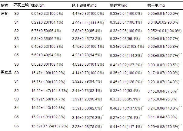 對小青菜而言(表 3),株高和地上部鮮重在修復中期表現出顯著的抑制,后期僅地上部鮮重在S6中與S0之間存在顯著性差異(為S0的117.7%);根鮮重及根干重則只是在修復后期出現極顯著的促進,前期和中期變化不明顯.根鮮重和根干重質量小的問題依然存在,因此,小青菜也不宜作為石油污染土壤微生物修復過程中生態毒性強弱的指示植物.