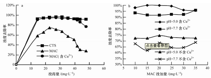 取pH=5.5,濁度為90 NTU的水樣,按以下方法做絮凝實(shí)驗(yàn)以期比較:①單獨(dú)投加殼聚糖溶液除濁;②單獨(dú)投加MAC除濁;③在有Cu2+(25 mg · L-1)的條件下,投加MAC除濁,結(jié)果如圖 7a所示.在濁度為160 NTU的高嶺土懸濁液中(含25 mg · L-1 Cu2+),調(diào)節(jié)溶液pH值至不同值,投加MAC除濁,結(jié)果見圖 7b.
