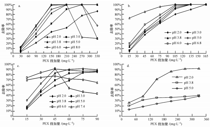 取僅含有一種類型重金屬且濃度均為25 mg · L-1的水樣,調(diào)節(jié)其pH為不同值后,投加不等量的PEX進(jìn)行絮凝實(shí)驗(yàn),研究了在不同pH值下PEX去除多種單一重金屬的效果.代表性實(shí)驗(yàn)結(jié)果舉例如圖 2所示.