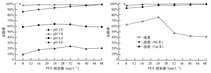 對(duì)PEX去除濁度的效能曾在兩種情況下做了對(duì)比:①以高嶺土配制濁度為90 NTU的水樣,調(diào)節(jié)pH值為不同值,投加不等量的PEX進(jìn)行絮凝實(shí)驗(yàn);②以高嶺土配制濁度為90 NTU的水樣,加入一定量的重金屬離子Ni(Ⅱ)或Cu(Ⅱ),使其濃度分別為25 mg · L-1,不調(diào)節(jié)體系pH值(pH約為7.7),投加不等量的PEX進(jìn)行絮凝實(shí)驗(yàn).實(shí)驗(yàn)結(jié)果如圖 1所示.