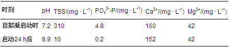 這些實驗結果充分證明,在微藻生長的正常pH范圍內(8~10),磷酸鈣是誘導自絮凝的關鍵沉淀物. 更具工程意義的是,Sukenik和Shelef(發現自絮凝的臨界pH值(絮凝效果達50%的pH)將隨PO43-(表 5)和Ca2+(未顯示)濃度的上升而下降; 在含高濃度Ca2+和PO43- 的培養液中,微藻自絮凝甚至可以在中性條件下就發生. 這說明當以含磷較高的市政污水為底物時,可相對較容易地在微藻生長的正常pH值范圍內,通過生成磷酸鈣沉淀同步實現自發性絮凝和高效除磷.