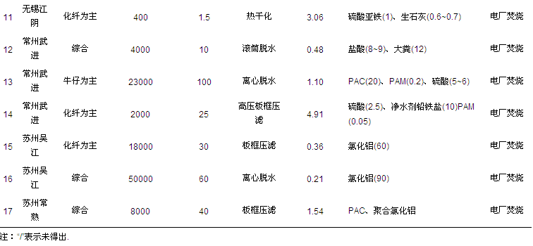 17家印染污水處理廠中,3家以棉布印染廢水為主,4家以化纖印染廢水為主,1家以牛仔印染廢水為主,剩余9家則綜合了棉、麻、絲、化纖、牛仔等多種類型廢水.各處理廠的規模大小不等,污水日處理量為400~50000 t · d-1,相應的脫水污泥產量為10~100 t · d-1,表 1給出了17家印染污水廠的基本情況.