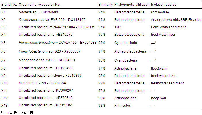 比較兩段微生物群落結構(圖 5a,表 2),發現二者微生物種類無顯著差異,但相對數量差異明顯,這主要是兩段間是連通的,但微生物生存環境持續改變所致.條帶X1、X5、X6、X7、X8、X12、X13所代表的微生物是好氧段中的優勢種群,而條帶X2、X9、X10則是缺氧段的優勢種群,主要為β變形菌綱(Betaproteobacteria)細菌.條帶X2為缺氧條件下的優勢菌群,測序發現其與脫氯單胞菌(Dechloromonas sp. DQ413167)的相似性達99%.研究表明,脫氯單胞菌為兼性厭氧革蘭氏陰性細菌,ClO3-、NO3-均可作為電子受體,能夠高效還原氯酸鹽和硝酸鹽,是重要的反硝化聚磷菌.X9和X10均為β變形菌綱中細菌,這些微生物的大量富集,可能與反應器的反硝化過程具有重要因果關系.