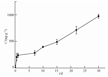圖 4說明了紅霉素在水草和斑馬魚體內含量隨時間的變化情況.從圖中可以看出,水草中紅霉素的含量在3 d時達到最高值12581.27 ng · g-1,然后維持在一個穩定值,在15 d時水草中紅霉素含量開始下降,于30 d時降至6745.96 ng · g-1,這可能與水草的生理特性有關.水生植物的表皮薄,可直接從水中吸收水分和養分.初始紅霉素在水相的濃度較高,水中的紅霉素在濃度梯度作用下自由擴散被吸收進入水草體內,并在體內積累;由于水生植物對紅霉素有代謝降解作用(Pomati et al., 2004),進入水草體內的紅霉素存在吸收和降解的平衡,故水草中紅霉素含量維持相對穩定;之后,隨著水相紅霉素濃度的降低,水草從水中吸收紅霉素速度減慢,慢于其代謝紅霉素的速率,水草內紅霉素濃度開始下降.